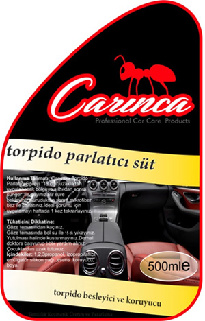 Araçların torpido, tampon ve tüm plastik yüzeylerini temizleyip, koruyarak parlaklık kazandıran, aynı zamanda antistatik özelliği sayesinde uzun süre toz tutunmasını engelleyen hoş kokulu bir üründür. Silikon bazlıdır. Uygulandığı yüzeyi korur çatlamalara neden olmaz. Konsantre üründür 1/5 oranında sulandırılabilir. 500 mll,5kg.